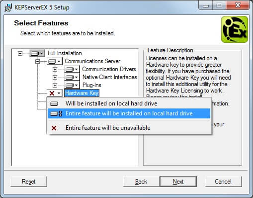 Important: An additional software feature must be installed in order for the hardware key to function properly. This can be done during the initial setup or at any time by re-running the product installation executable and selecting Modify. In Select Features, locate Hardware Key and then select Entire feature will be installed on the local hard drive. Then, continue through and complete the install. For more information, refer to Kepware Installation Guide.