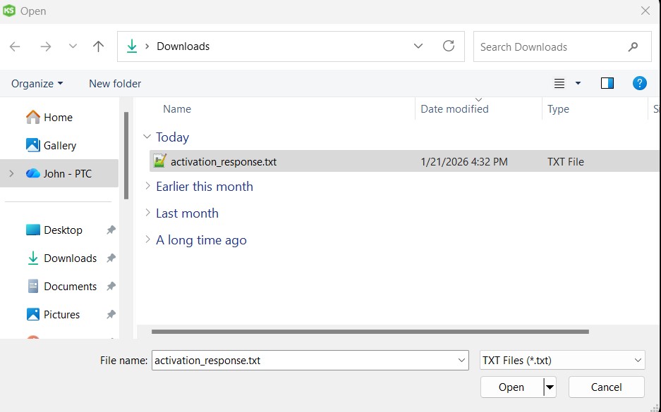 Note: The default filename for the activation response file is “activation_response.txt.” Users can rename the file to ease license management, which may be especially helpful when activating more than one product at one time. - Next, return to the License Utility. Click Import File and browse to the downloaded “activation_response” file received from the My Kepware portal, and then click Open.