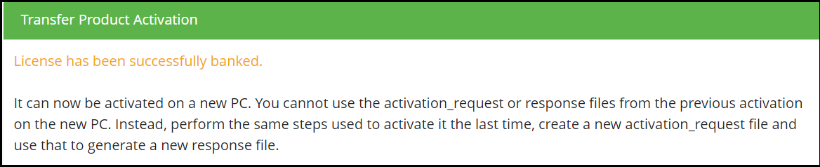 Note: At this point, the transfer request file will be processed and a message will be displayed that indicates the license has been successfully stored in the online account. At this point, the transferred product is now available for activation on another machine.
