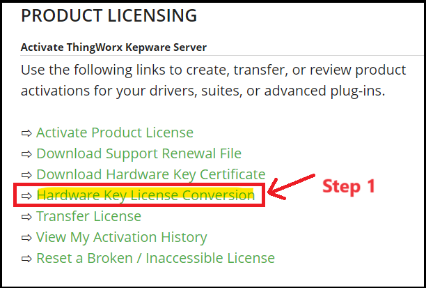 - To start, login to your My Kepware account and select Hardware Key License Conversion on the home page.