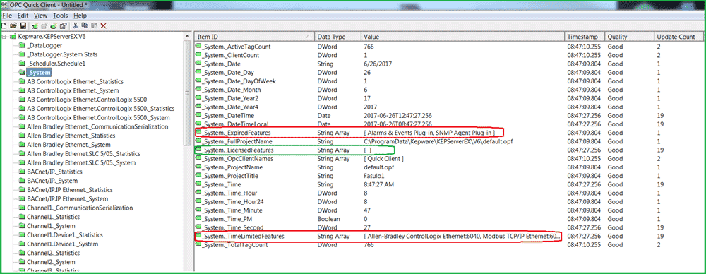 The following screenshot highlights the three "._System" tags that contain the information needed to diagnose which components are running in "Time Limited Mode". Specifically, the "._System._TimeLimitedFeatures" tag contains the name of the unlicensed component being used, as well as the amount of time (in seconds) remaining until the component has run out of time and therefore populates the "._System._ExpiredFeatures" tag.