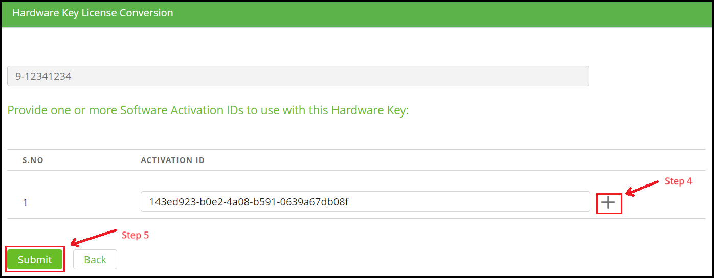 - Copy and paste the software license(s) that you would like moved to the hardware key into the Activation ID field. Click the + to the right of the field in order to add additional licenses to the same hardware key. Any errors received during this process will provide clear guidance on what is wrong. For more information on errors and frequently asked questions, see the bottom of this page.
