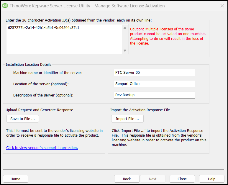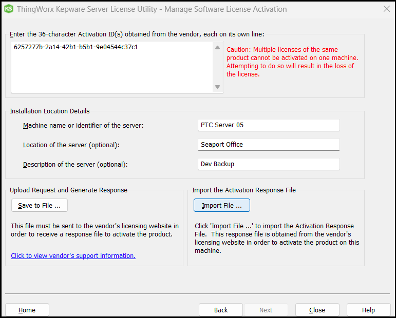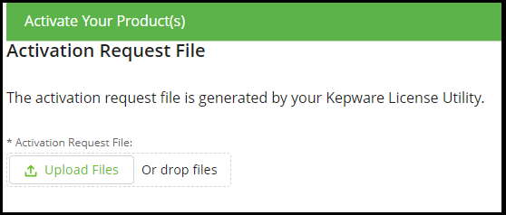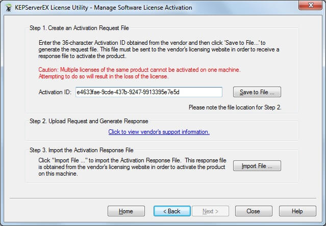 - Next, return to the License Utility. In Manage Software License Activation, locate Import the Activation Response File and then click Import File. Browse to the downloaded activation response file received from the My Kepware portal, and then click Open.