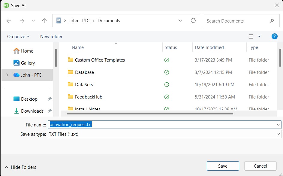 NOTE: The (Optional) fields are useful for Tech Support to locate a lost license, populating them is highly recommended. - The License Utility will generate the request file (“activation_request.txt”) and then display a file-browse dialog. Save the request file, making note of its location as it will be sent to the My Kepware portal in the next step.