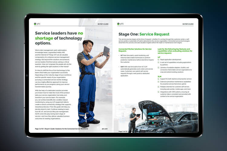 This buyer’s guide breaks out the following key stages of the service journey and how connected technologies like AR, IoT, and service lifecycle management (SLM) can help streamline these processes at every step: