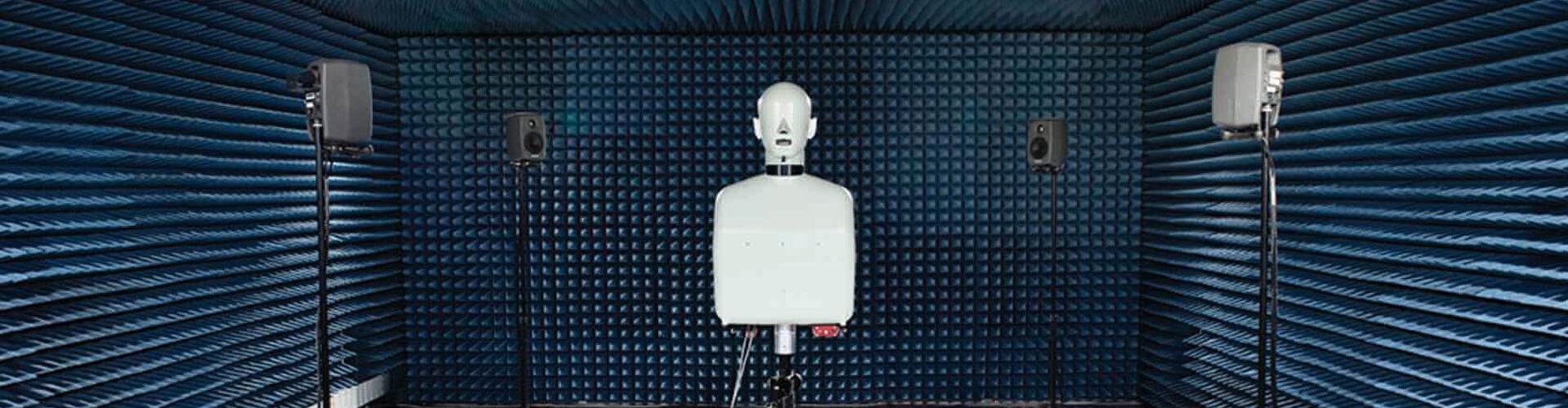 Wherever else you go you will have some sort of background noise. The sound lab is one of the places where you can measure the internal noise in devices by removing everything else. These anechoic chambers have an array of speakers which give 360-degree coverage. Standing on a wire grid, the user is placed within a complete sphere where the sound can be meticulously controlled, enabling the team to reproduce various sound environments. It’s an extended version of the 5+1 speaker system you can have at home, but a 49+4 speaker system. This enables the engineers to reproduce any sound again and again. “Reproducibility is super important,” says Urup. “When you tweak somewhere in the code, in the algorithms, whether it’s transmitted so that all the recorded sound can be found, or whether it’s noise cancellation algorithms that you’re tweaking, being able to then have a reproducible result when you say, ‘So, what was the result of that?’ is important. You need labs like this to be able to do the same measurement again and again. Here we can control the variables.”