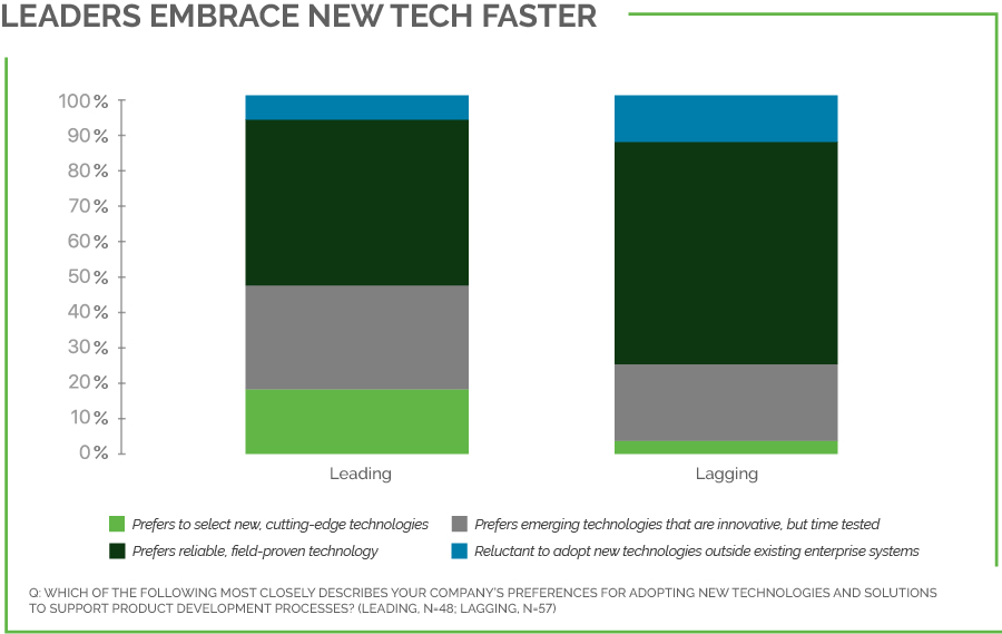 For this white paper, we focus on respondents who self-identified as either industry leaders or laggards. These respondents were asked: “When it comes to physical product development, do you believe your company to be leading or lagging the competition when it comes to leveraging the latest technologies and solutions?” They divided themselves into two groups: 46% identified as leading, and 54% identified as lagging.
