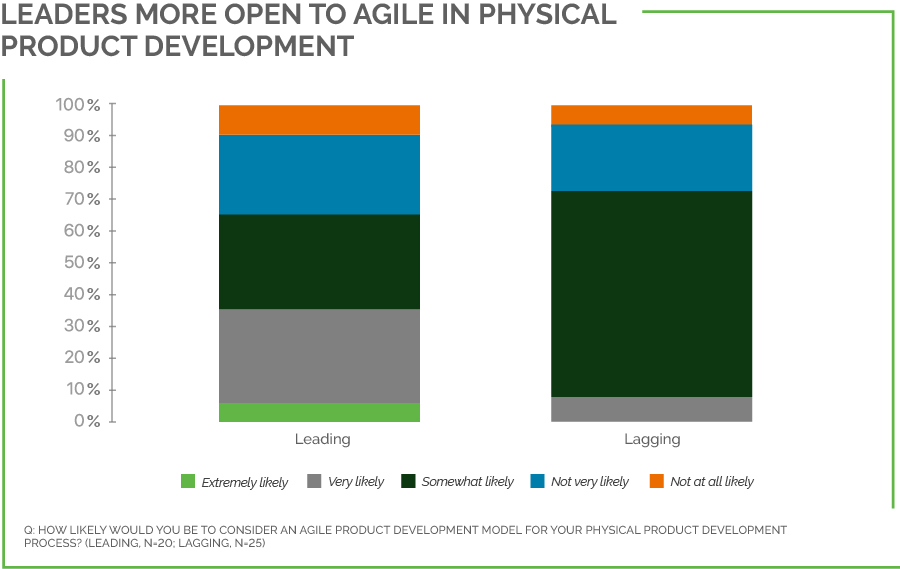 Leaders distinguished themselves in this category by expressing this confidence: 35% of leaders said they were at least very likely to consider Agile methodologies for their physical product creation, compared to only 8% of laggards. While it is true that laggards were significantly more likely to say “somewhat likely” (64% vs. 30% of leaders), we view this as proof of hesitation, not of confidence.