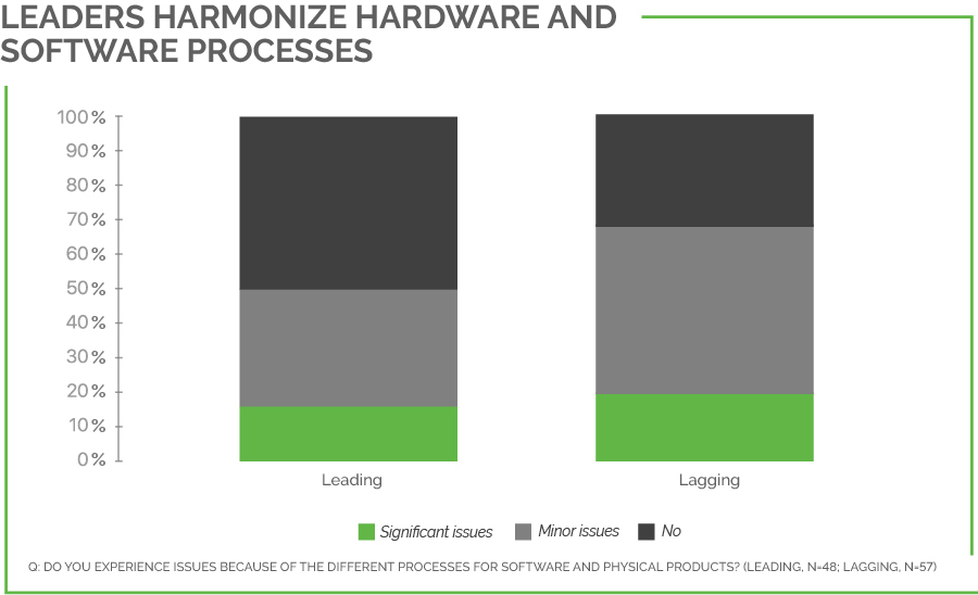 We do not need to dig too far into the respondents’ data to start to see potential signs of discrepancies. While hardware and software processes can differ, and both can still be considered fundamentally Agile, leaders and laggards reported very different results when asked if issues arose from different developmental processes for hardware and software: