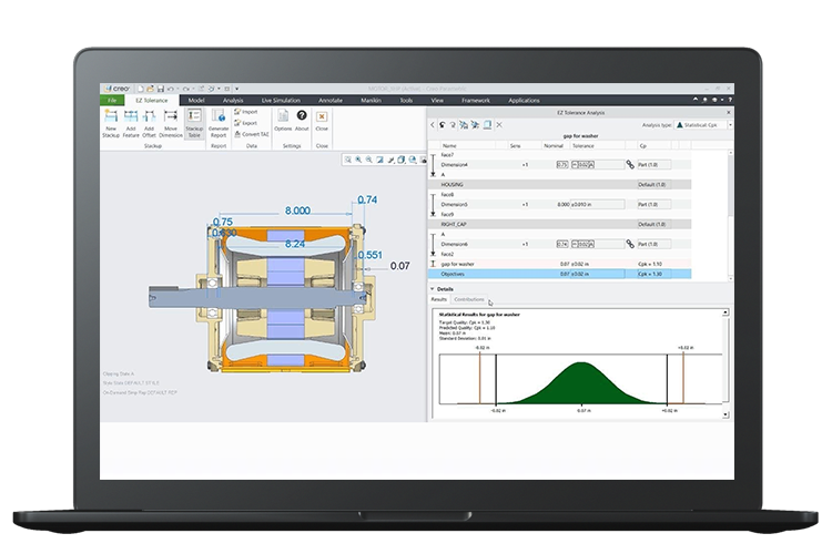 Creo EZ Tolerance Analysis Extension is an extension to Creo Parametric. With Creo EZ Tolerance Analysis Extension you can evaluate the impact of dimensioning on product designs before either prototyping or manufacturing.