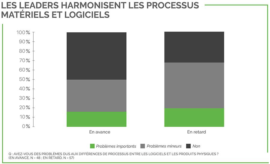 Il n'y a pas besoin d'éplucher les données des participants pour relever les premiers signes potentiels d’incohérences. Bien que les processus matériels et logiciels puissent différer, et même si les deux peuvent toujours être considérés comme fondamentalement Agile, les leaders et les retardataires ont produit des résultats très différents lorsqu’on leur a demandé si des problèmes résultaient de processus de développement différents pour le matériel et les logiciels :