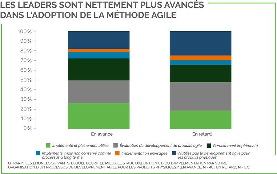 La confiance exprimée dans les réponses des leaders contraste fortement avec l’incertitude des retardataires. Si 58 % des retardataires étaient vraiment Agile, pourquoi étaient-ils 64 % à déclarer être moyennement enclins à déclarer qu’ils l’utiliseraient dans le développement physique ? En se montrant plus fermes dans leurs choix, nous considérons que les leaders ont une meilleure compréhension d’Agile et de leurs processus et savent quand Agile est la bonne solution.