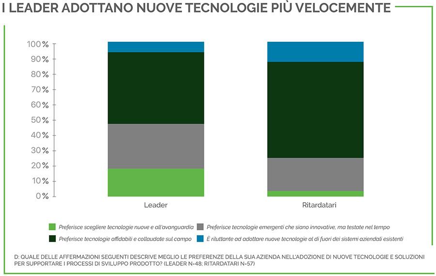 Agile est également centrée sur la transparence et la réduction des risques. Les processus de développement de produits Agile permettent généralement aux utilisateurs autorisés d’avoir une vue d’ensemble rapide du processus du projet, ce qui donne une visibilité immédiate sur tout obstacle. Capturer ces processus s'avère crucial pour pouvoir les observer avec plus de précision, et les données montrent que les leaders sont systématiquement plus susceptibles d’utiliser des technologies de transformation digitale qui facilitent mieux la capture des données (voir le tableau pour les comparaisons).