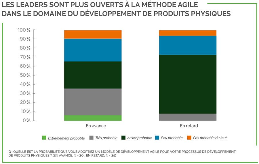 Les leaders se sont distingués dans cette catégorie en exprimant cette confiance : 35 % d'entre eux ont en effet déclaré qu’ils étaient au moins très susceptibles d’envisager des méthodologies Agile pour la création de leurs produits physiques, contre seulement 8 % des retardataires. S’il est vrai que les retardataires étaient significativement plus susceptibles de répondre « assez probable » (64 % contre 30 % des leaders), nous considérons cela comme une preuve d’hésitation et non de confiance.