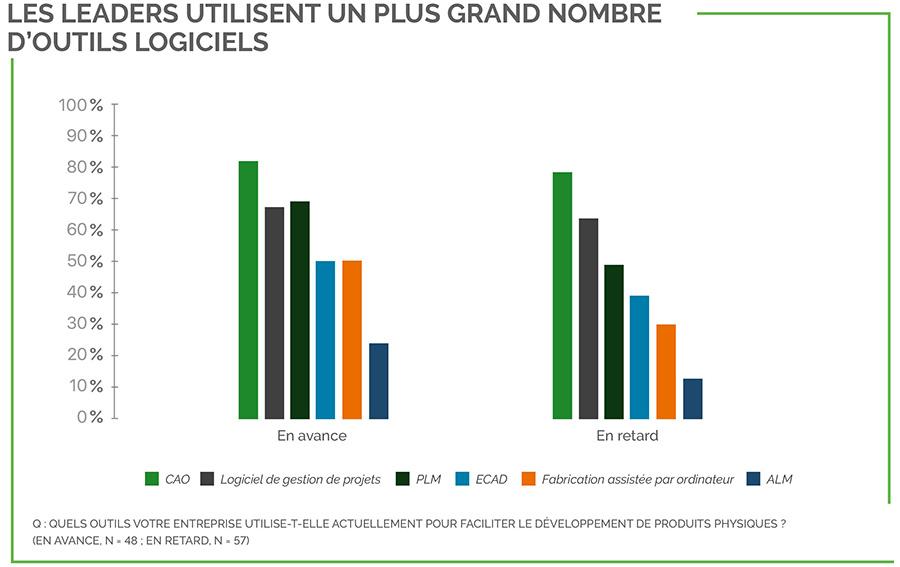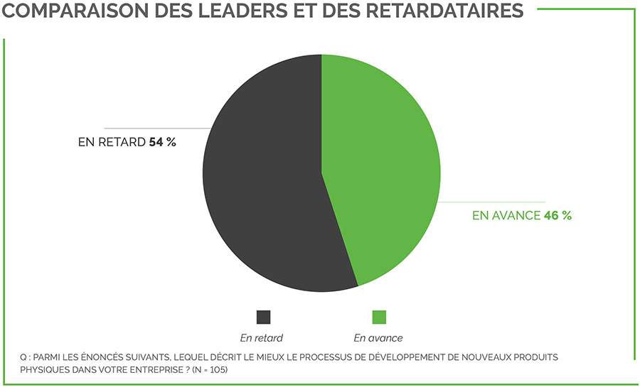 Pour ce livre blanc, nous nous concentrons sur les personnes interrogées qui se sont identifiées soit comme des leaders du secteur, soit comme des retardataires. La question suivante leur a été posée : « En matière de développement de produits physiques, pensez-vous que votre entreprise est en avance ou en retard sur la concurrence lorsqu’il s’agit d’exploiter les dernières technologies et solutions ? » Deux groupes ont donc émergé : 46 % se sont identifiés comme étant en avance et 54 % comme étant en retard.