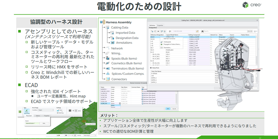 電動化のための設計機能も今回の大幅な強化点です。特に、大規模なハーネスをアセンブリとして扱う機能が充実しており、これについては後ほど詳しくご紹介します。