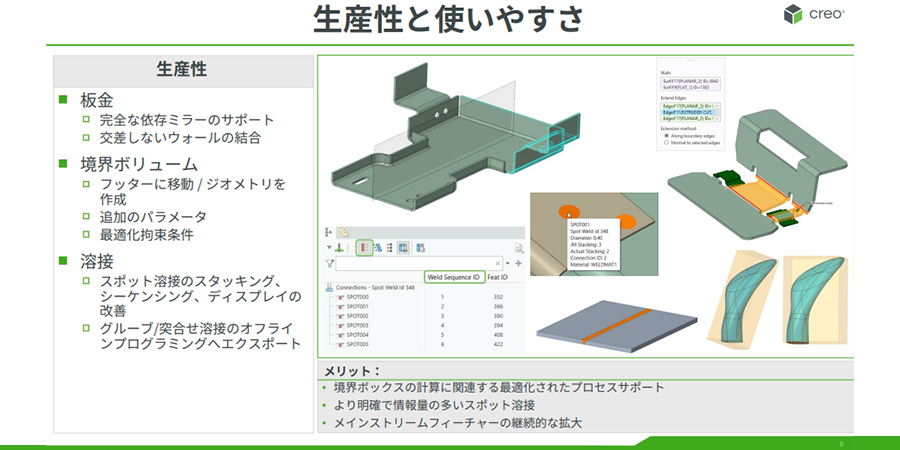 Creo NC(数値制御)モジュールも進化を遂げています。高速マシニングにおいては、新たにアンダーカット加工が可能になり、高速加工機能も今回さらに強化されました。その他、NC 機能でのマルチボディサポートが実現されました。これにより、NC 作業でもマルチボディを効率的に活用できるようになり、外部から多くの部品ファイルを取り込む必要がなくなるなど、設計から製造までの連携がよりスムーズになります。