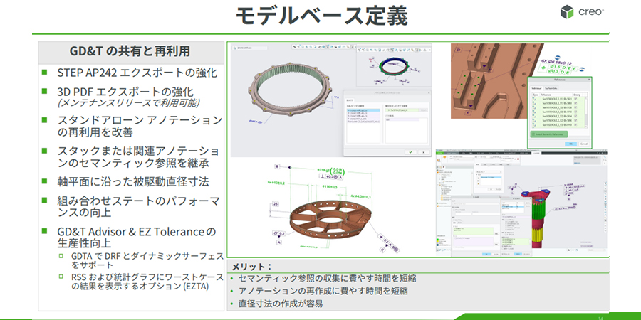 モデルベース定義 (MBD) も重要なテーマです。Creo の 3D アノテーション機能は競合他社と比較しても高く評価されていますが、今回は特にエクスポートにおける再利用性が強化されました。