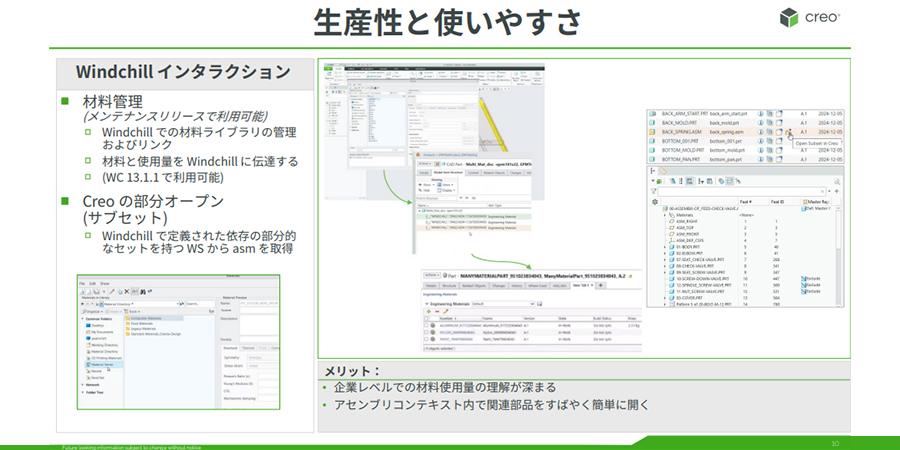 もう一つは部分オープンサブセット機能です。これはパフォーマンス向上に寄与します。例えば、スーパー BOM(部品表)を使用する際に、フィルターで絞り込んだサブセットをワークスペースに追加すると、そのサブセットを Creo で簡略表示として直接開けるようになりました。この機能は、特にバリエーション設計を行っているお客様にとって非常に有効で、Windchill と Creo 間の連携がさらに高度化しています。