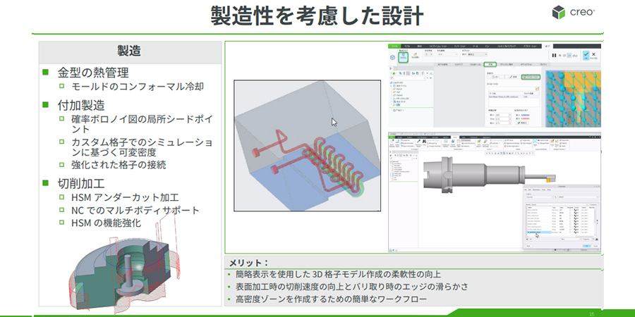 もちろん、Creo の製造機能も進化しています。高速マシニングに対応するアンダーカット加工といった機能のほか、3D プリント用の機能なども追加されています。