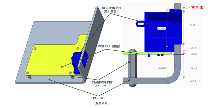 右の断面に示す REC-3PIN.PRT(青い部品)と PAN.PRT(板金部品)の間のすきまを検証します。すきまが 0 以下では組立ができず、また、大きすぎると製品の見栄えが悪くなります。