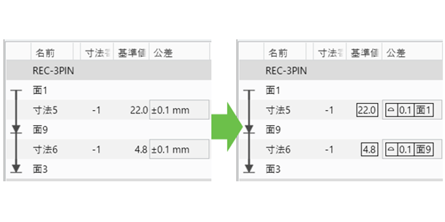 この「統計:∑」の結果で目標を達成できるように、個々の公差を調整してみます。