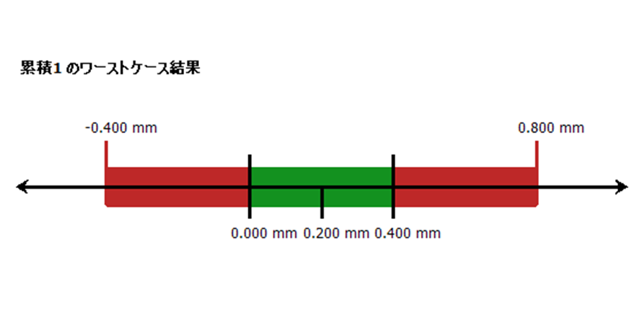 結果の表示で、目標と現状を比較することができます。「ワーストケース」の結果の評価では、すきまが、最小 -0.4mm 最大 0.8mm となり目標を大きく外れていることが判ります。