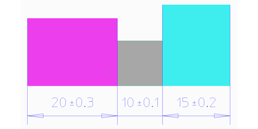 部品の寸法と公差をそれぞれ、20±0.3、10±0.1、15±0.2 と定義した場合、積み上げた寸法と公差は、45±0.6 となります。