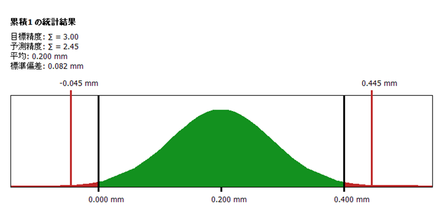 寸法の公差が正規分布する場合、それを積上げた公差の累積も正規分布します(下図参照)。