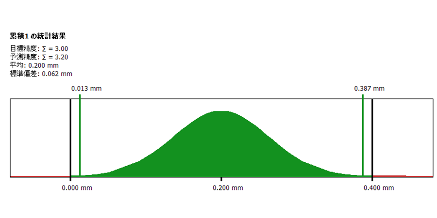 図の赤い縦線は先程のワーストケースでの積上げ計算の最大/最小の範囲ですが、両端付近では発生する確率が低いことが解ります。