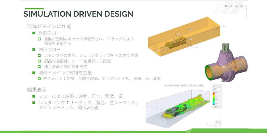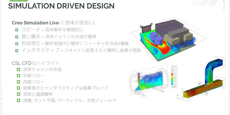 「Creo Simulation Live Advanced」について、先ほど流体解析には上位のライセンスが必要だという点に触れましたが、流体解析についても非常に高速でリアルタイムな解析を実現しています。流体解析に関しても、同様にGPUコンピューティングを活用し、迅速な解析が可能となっています。