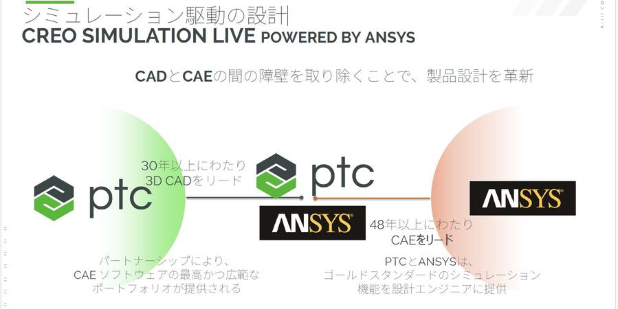 まず、ここにいきなりPTCのロゴとAnsysのロゴが表示されていますが、皆さんご存知のように、Creoを提供しているPTCは30年以上にわたって3次元CADをリードしてきました。では、なぜここにAnsysのロゴが出てくるのかについては、少し後で説明いたしますが、Ansysは40年以上にわたってCAEをリードしている会社です。