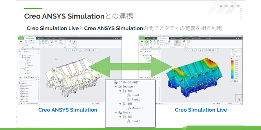 具体的には、Ansys Simulation側で定義したスタディをCreo Simulation Live側で利用でき、逆にSimulation Live側で定義したスタディもAnsys Simulationで利用できます。また、どちらかで変更があった場合、その変更が反対側にも反映されるため、双方向でのデータ更新が可能です。