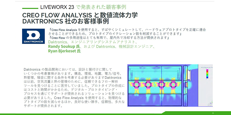 しかし、大型パネルの試作品を何個も作ることは難しいため、シミュレーションを活用して、発熱を抑えるための精度の高い計算を行いたいと考えていました。さまざまなCFDツールを検討しましたが、最終的にCreoを使用しており、その中のFlow Analysisを選択しました。Flow Analysisを使うことで、思い通りに熱管理ができ、効果的に発熱対策ができたというコメントをいただいています。