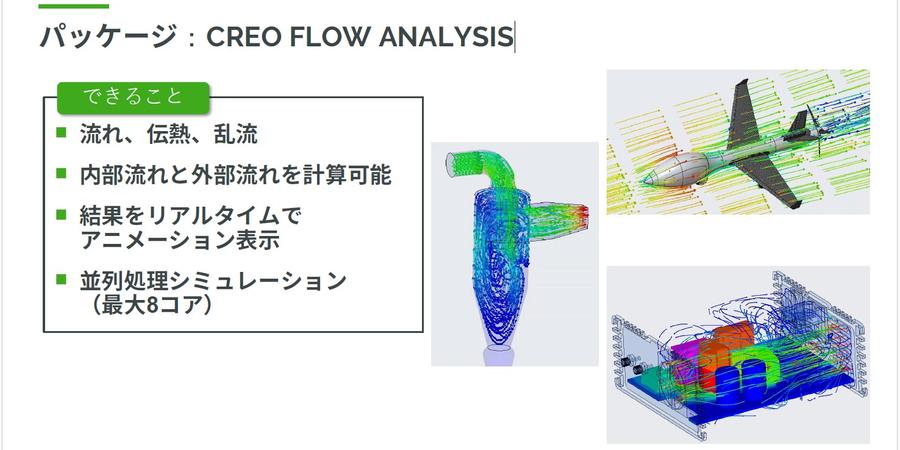 「Advanced」や「Premium」パッケージは、より複雑な流体計算が可能で、より高度な解析を行いたい場合に適しています。一方、Basicパッケージにあたる「Creo Flow Analysis」は、基本的な流れと熱の計算に対応しています。これまでは設計者が熱伝達率を公式や経験則に基づいて計算し、構造解析ツールを使って計算していました。しかし、流体解析は時間がかかるうえに難しそうだと感じ、あまり利用されていなかったかもしれません。