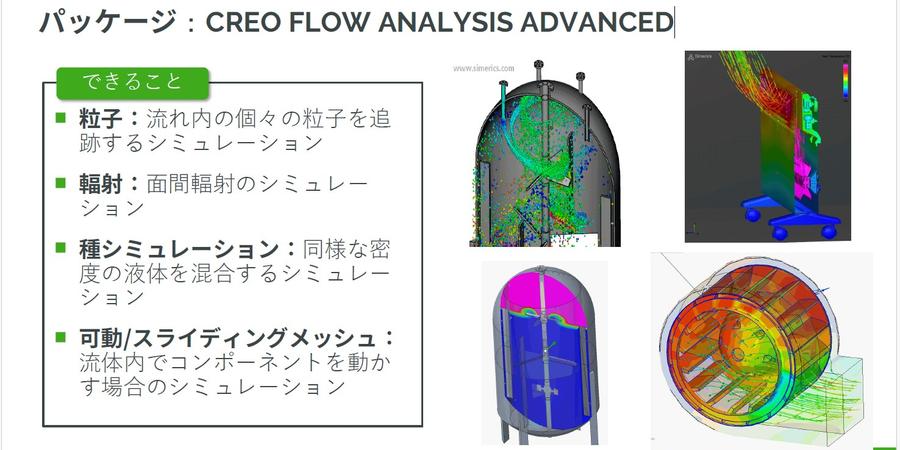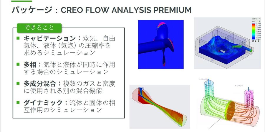 設計者に限らず、専門家の方々も複雑な計算を行いたいというニーズがあると思います。そうした方々のために、Creo Flow Analysisではさまざまな解析タイプを用意しています。これらの解析タイプを実現するために、3つのパッケージが提供されています。これらのパッケージは「Creo Flow Analysis」、その上位版「Advanced」、さらに「Premium」となっています。それぞれのパッケージで実行できる解析タイプが異なり、どのパッケージを使用するかによってできる解析が変わります。