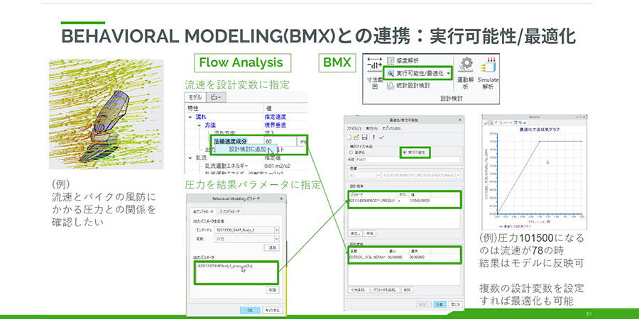 BMXとの連携:BMX(Behavioral Modeling Extension)は感度解析や最適化を行うためのオプションモジュールです。設計者は寸法やパラメーターを最適化し、流体解析と連携させることができます。これにより、設計者が早期の段階でさまざまな検討やパラメーター設定を行いながら流体解析を進められます。