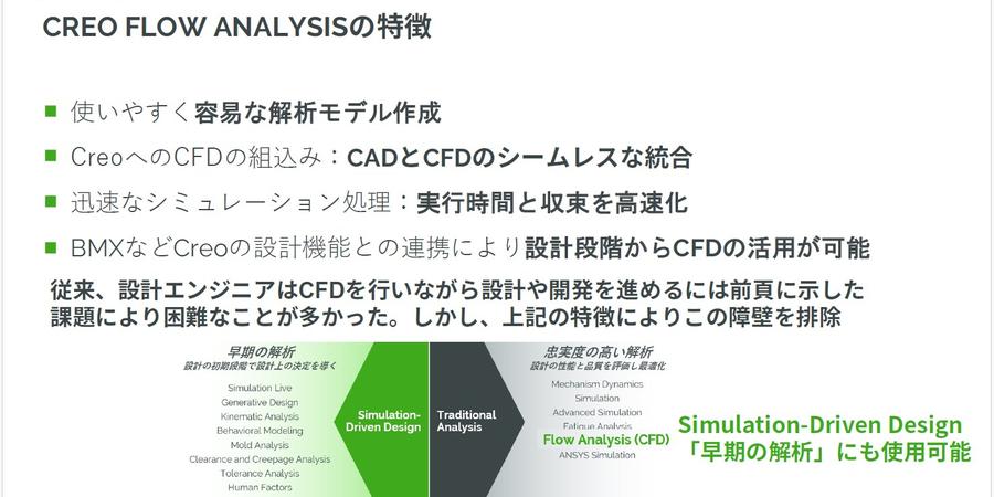 これらの特徴により、設計者は早期段階で流体解析を行うことができ、従来のように専門家だけでなく、設計者自身が積極的に解析に取り組むことができるようになります。Creo Flow AnalysisはもともとTraditional Analysisに分類されますが、これらの特徴により設計の初期段階でも流体解析を行えるというメリットがあります。