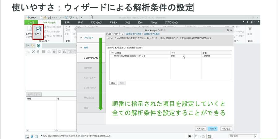 ウィザード機能は、設定すべき項目を順番に問いかけてきます。設計者はその都度質問に答えるだけで、簡単に設定を完了できます。例えば、プロジェクト名や解析する物理現象、重力の有無、流体ドメインの作成の有無などを順に設定することで、解析条件が自動的に定義されます。この方法なら、一度操作を覚えておけば、次回解析を行う際にも覚え直す必要がなく、非常に使いやすくなります。