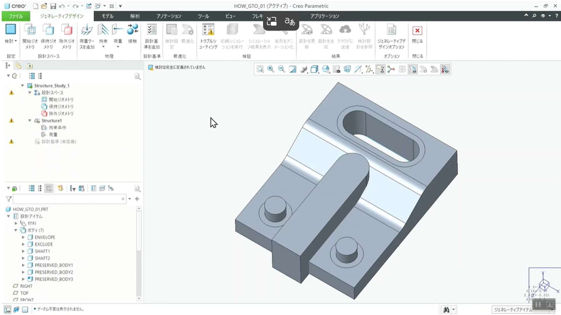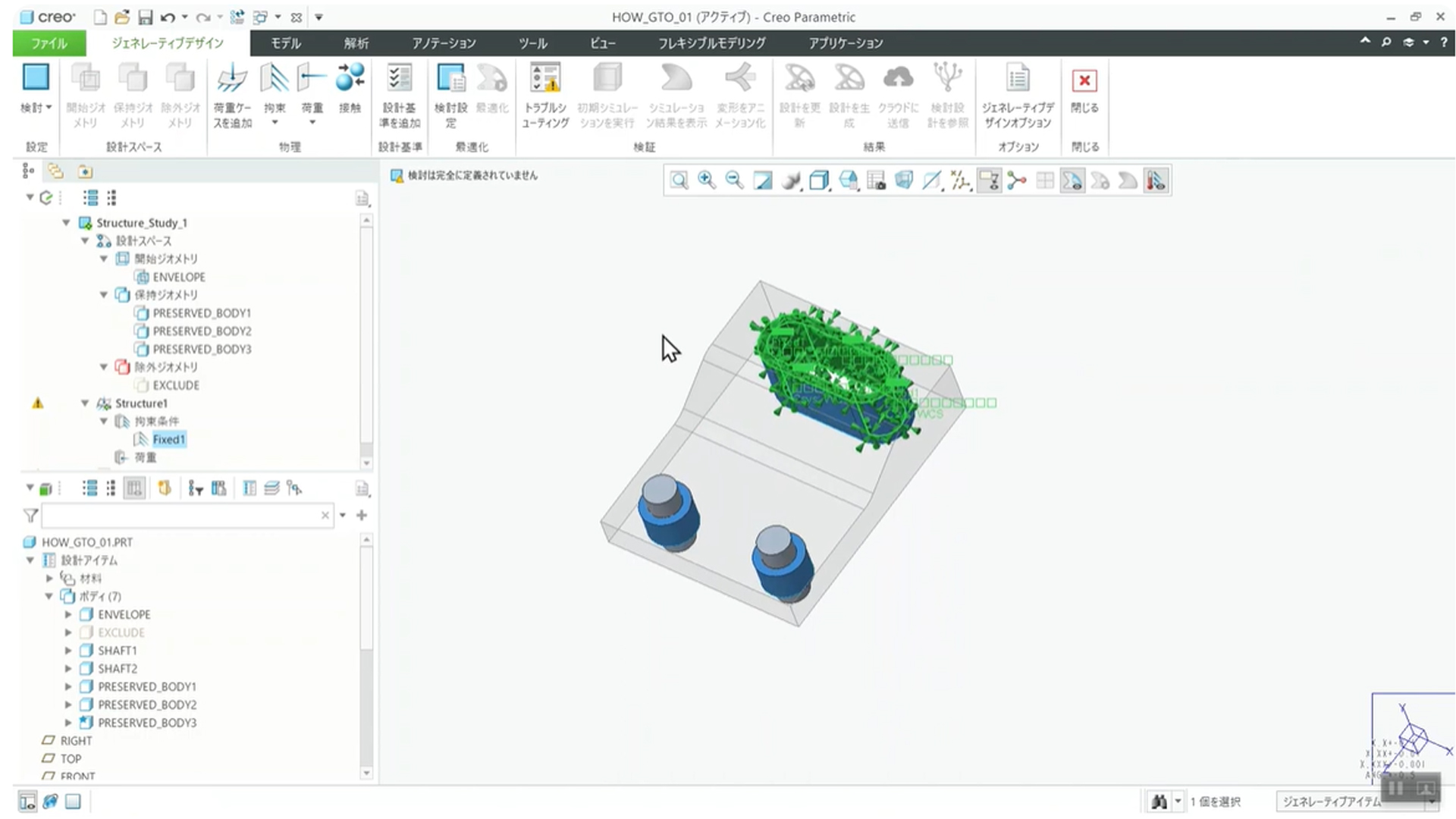 Creo の GTO は、高度な機能でありながら直感的な操作フローで実行できるのが特徴です。ここでは、マルチボディ機能(1つのファイル内に複数の部品データを保持する機能)で構成されたモデルを例に、最適化の基本的な流れを5つのステップで解説します。