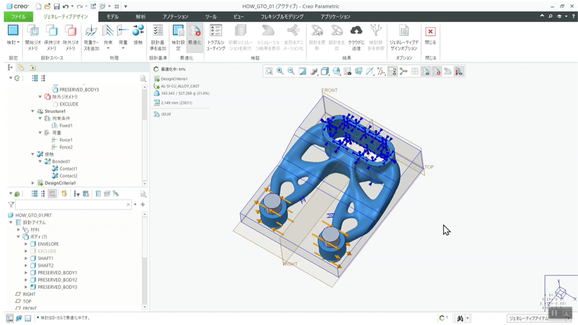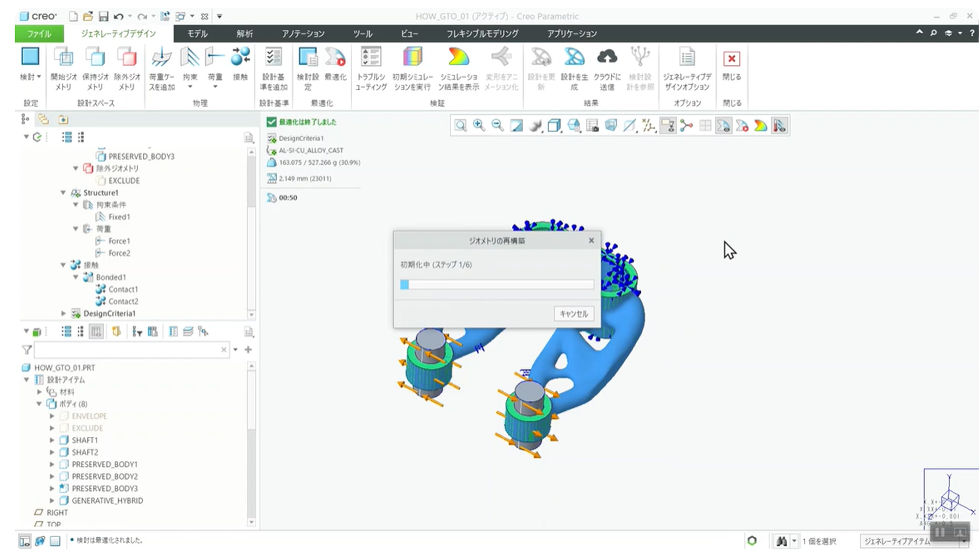 上部メニューの「最適化」をクリックすると計算が始まります。ビュー上でリアルタイムに形状が変化していく様子を確認できます。Creo GTO の特徴の一つは、この計算が非常に高速な点です。動画のシンプルなモデルでは、わずか50秒で計算が完了しました。