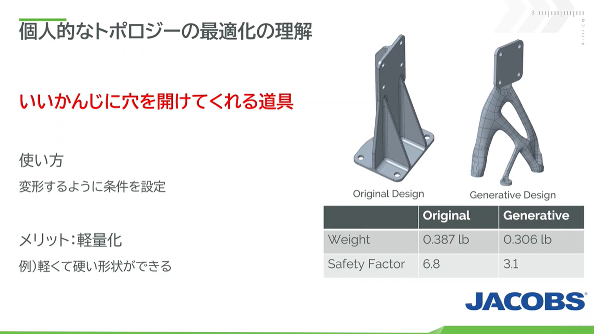 左の「オリジナルデザイン」は、人間が設計した直線的で分かりやすい形状です。一方、右の「ジェネレーティブデザイン」は、トポロジー最適化によって生成されたぐにゃぐにゃとして複雑な形状をしています。