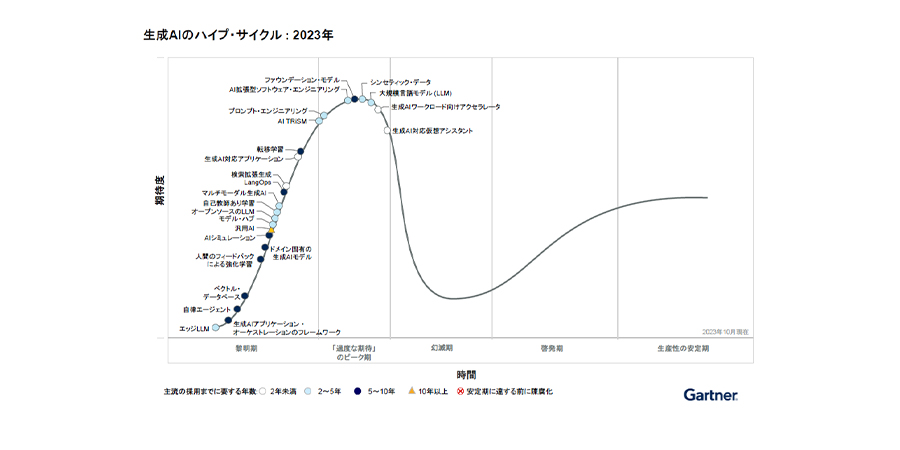 業界予測を行う Gartner は2023年10月、「2026年までに、80%以上の企業が生成 AI の API やモデルを使用して、生成 AI に対応したアプリケーションを本稼働環境に展開するようになる」との見解を発表しています。(注2