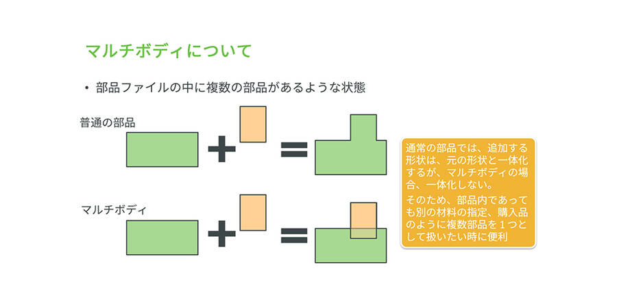 マルチボディ機能を活用することで、シンプルなトップダウン設計の実践や、パーツの分割・統合を駆使したフレキシブルな設計が可能です。操作方法も非常に簡単ですのでご興味ある方はぜひ活用を検討してみてください。