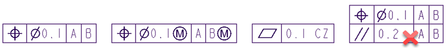 幾何公差の枠には左から幾何特性の記号、公差値、(必要であれば)データムを記入します。公差域が円や円筒であれば φ、球であれば Sφ を公差値の前に付けます。共通公差域である CZ や突出公差域Ⓟなども、公差位置と同じ枠内に記入します。ⓂやⓁの実態状態ですが、こちらは公差付き形体に対する場合は公差値の枠へ、データムに対する場合はデータムの枠へ記入します。1 つの形体に対して複数の幾何公差を指示することができますが、姿勢公差は位置公差よりも厳しい値でなくてはいけません。位置で指示した公差値よりも大きい場合は、姿勢を指示する意味がないからです。