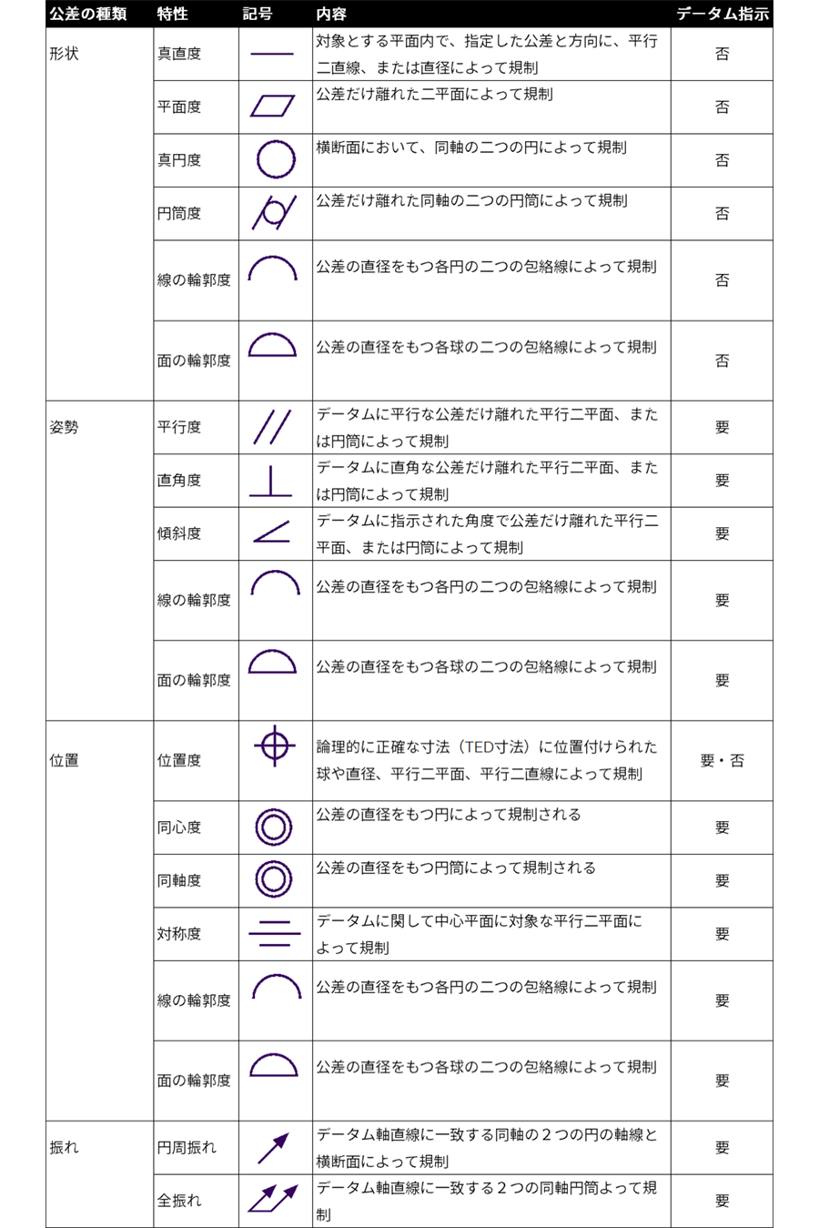 関連形体は他の形体との関係により決まるものになります。上記の表の「データム指示」を見ると、関連形体である「姿勢」「位置」「振れ」の部分で「要」になっていますが、このデータム指示により他の形体と関連付けを行います。