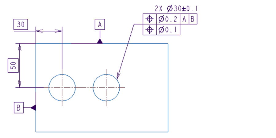 また公差値の引出線位置でも意味が変わってきます。例えば直線寸法の寸法線と同一線上にある場合やその中心、寸法線とずれている場合は、その寸法補助線が出ている形体に対して指示します。