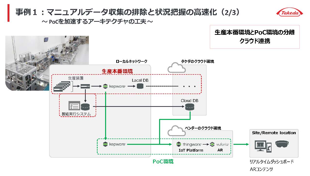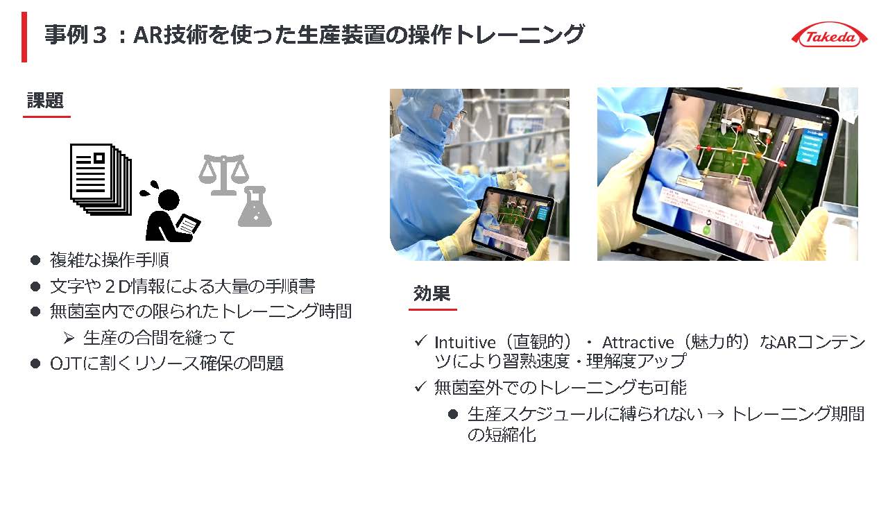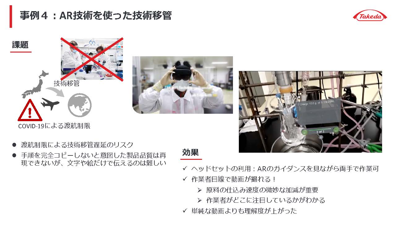 2 つ目は製造拠点間の技術移転に AR 技術を適用した事例だ。世界各地に製造拠点を持つ武田薬品では、製品の展開に合わせてある拠点で製造している製品を他の拠点でも製造することが国をまたいで計画される。従来は熟練した技術者が移管予定先の拠点へ出張し、製造現場の指導にあたっていた。しかしコロナ禍における渡航制限などにより出張がなかなかできず、技術移菅がままならない状態となっていた。医薬品を設計通り製造するには、その製造手順を完璧に再現する必要があるのだが、現地での技術指導なしに、電子メールや電話でやり取りしながら、文字や絵だけで正確に伝えるのは極めて困難である。