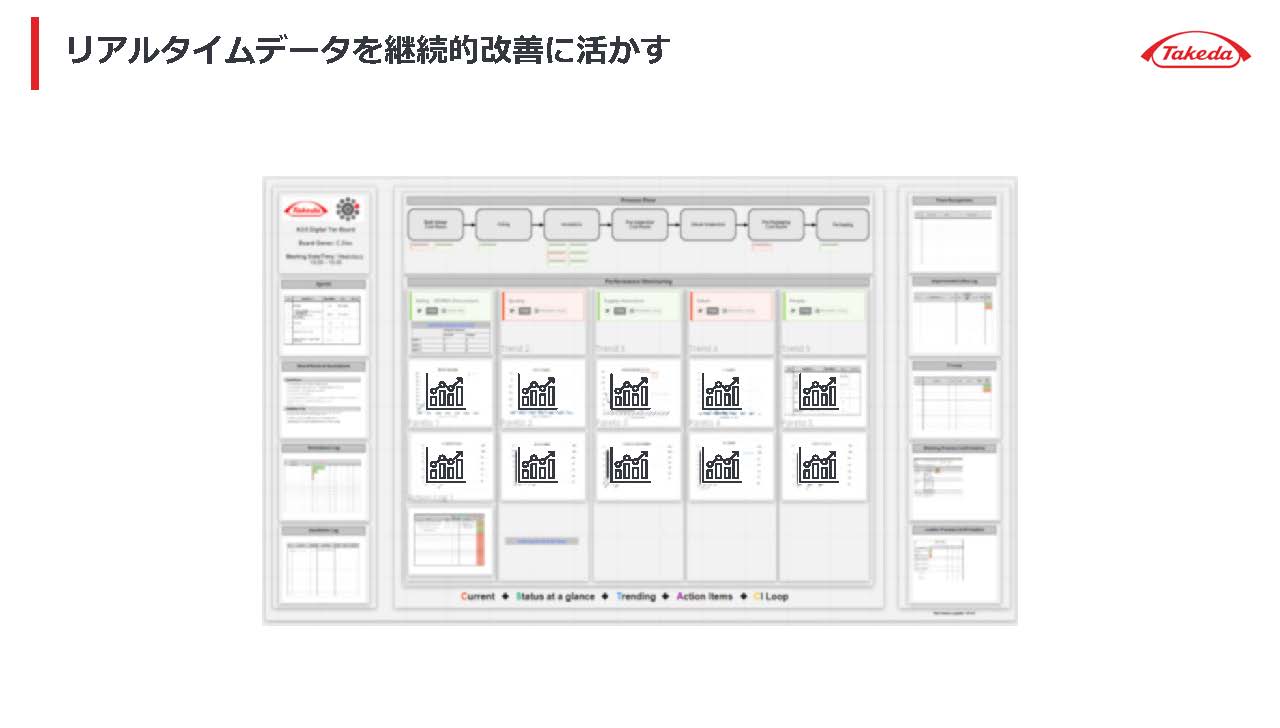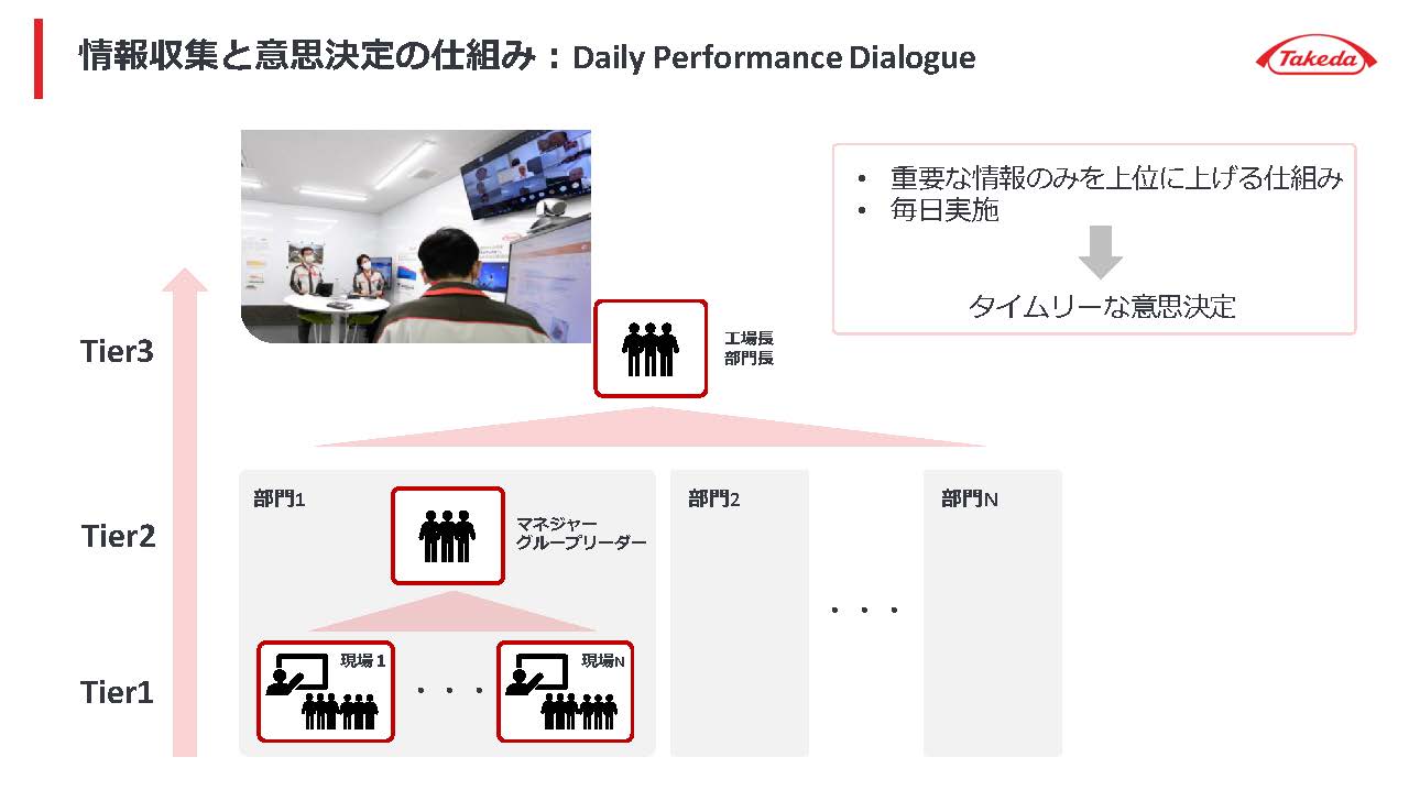 武田薬品では毎朝、現場の各グループでパフォーマンスダイアログと呼ばれるミーティングを実施している。日々起こった出来事やトラブルについて情報共有し、さらにそれに対するアクションの決定などが行われる。ミーティングの中で、現場で対処が難しい問題や工場全体で共有すべき重要な案件が出てくれば、工場長や部門長に報告を上げて、対処や意思決定を仰ぐ仕組みが構築されているという。
