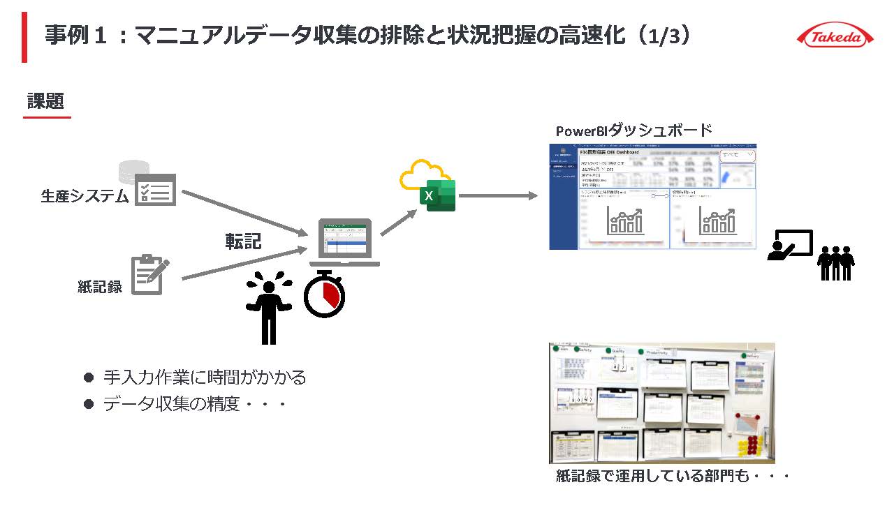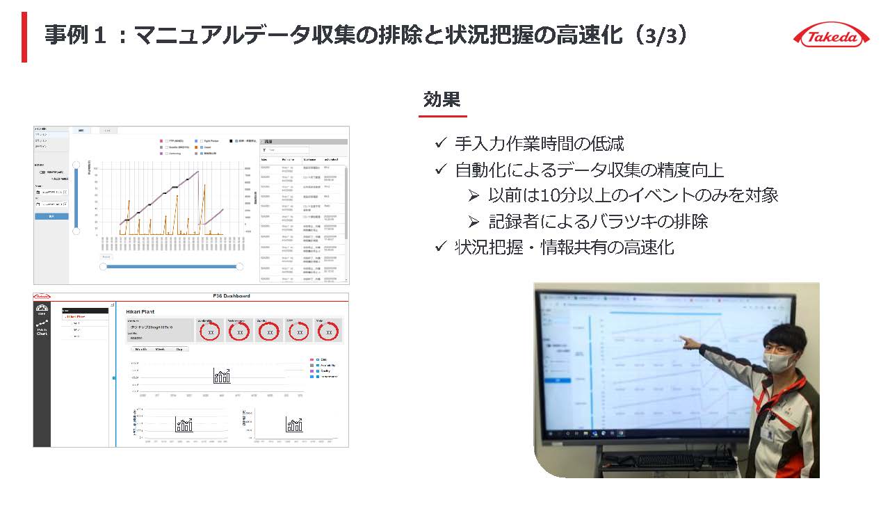 本講演では、武田薬品工業株式会社(以下、武田薬品)グローバルマニュファクチャリング&サプライ ジャパン 戦略企画部 データサイエンスグループ グループマネジャー深川 俊介 氏が登壇。迅速な状況把握や意思決定の高速化のために同社が取り組むデータドリブン(※)マニュファクチャリングについて、同社製造拠点におけるリアルタイムダッシュボード導入を 2 事例、AR(拡張現実)コンテンツ活用を 2 事例を示しながら紹介した。
